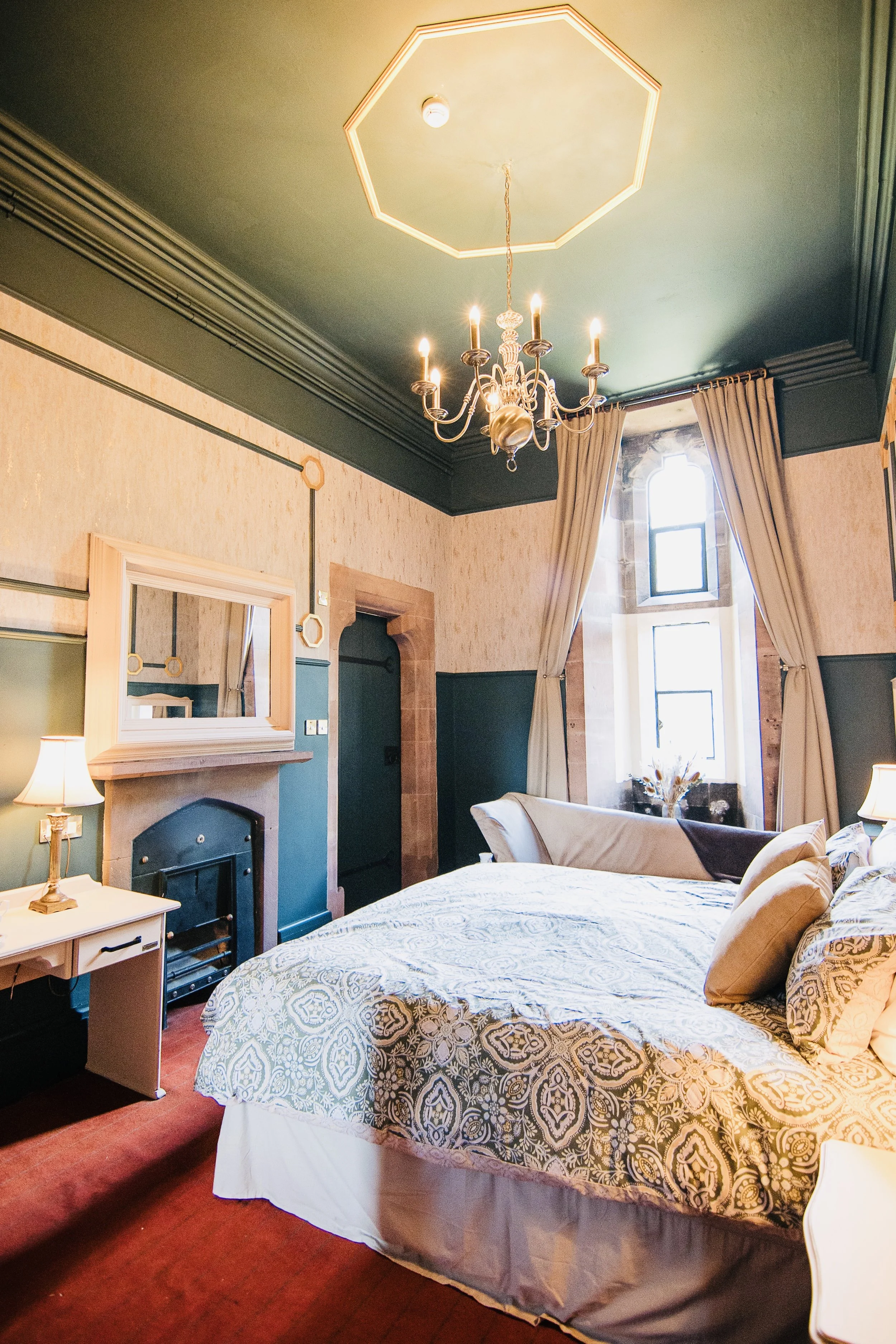 A deep green is used across the walls to anchor the room - drawing on the surrounding landscape and providing a sense of depth against the architectural detailing. This is balanced with a softer, chalky pink across the furniture, which lifts the palette and introduces a more gentle, domestic quality.